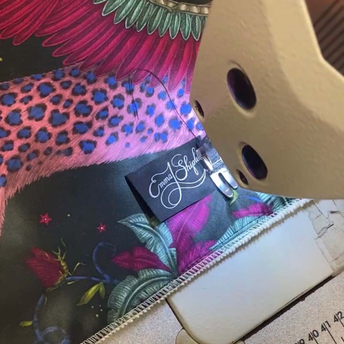 5. The Emma J Shipley label is added to the back of the cushion, and velvet piping or fringing is sewn in.