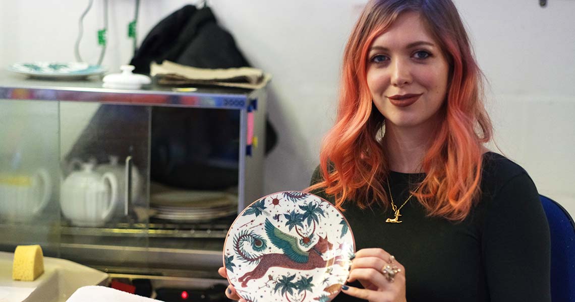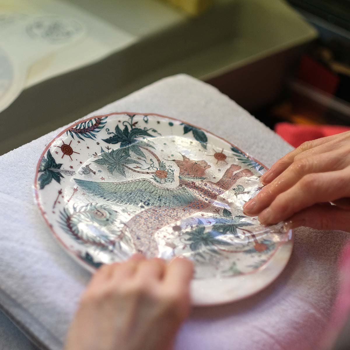 The lithographs are dipped in water which lifts the design from the backing and these are then slid onto the plate and positioned with the help of a sponge.