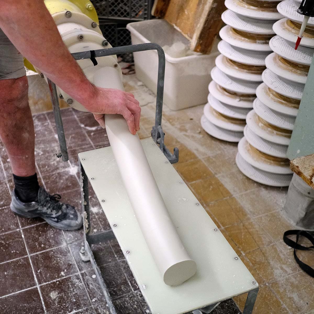 Then, at our fine china factory, the bone china clay is filtered and extruded to create rolls of clay, ready to be added to the moulds.