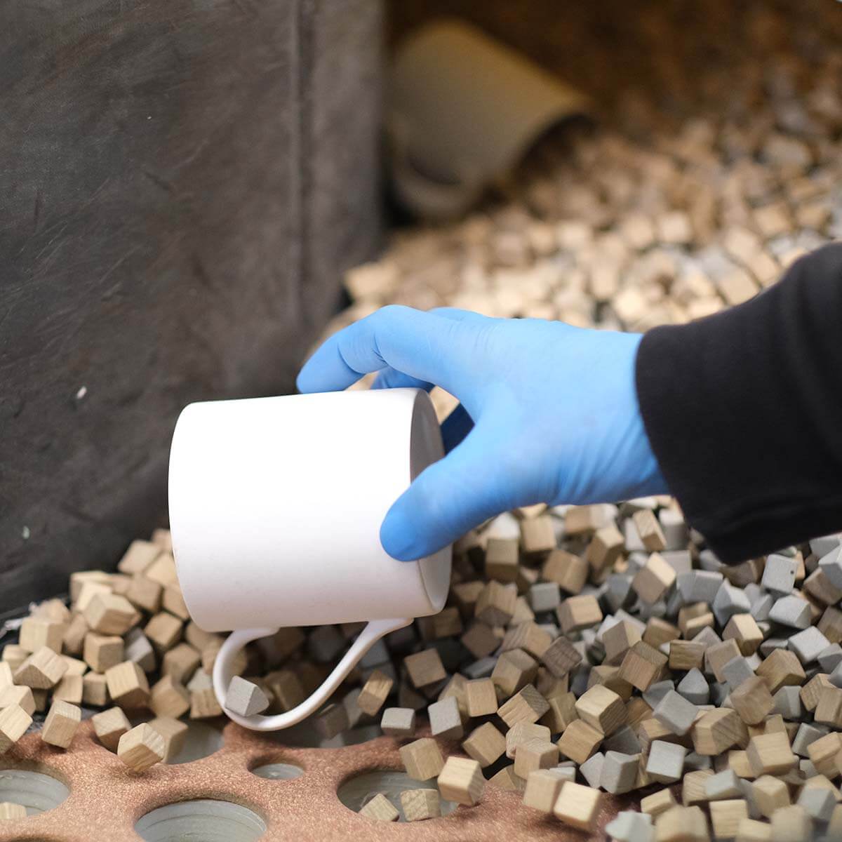 The biscuit fired plates are added to the Vibro machine to clean and polish the ware before glazing (demonstrated with the mugs here)