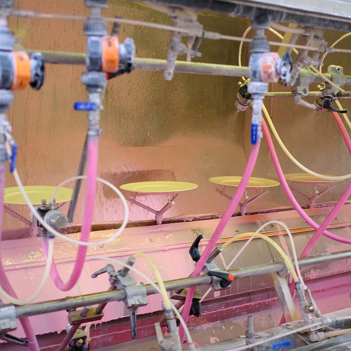 A liquid glaze is added to each plate using a conveyer belt. Taking the plates through the pink liquid glaze and onwards to a heated chamber to dry.