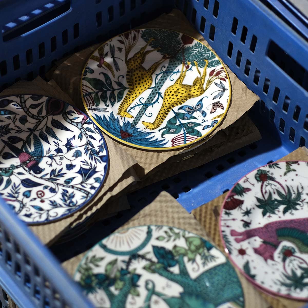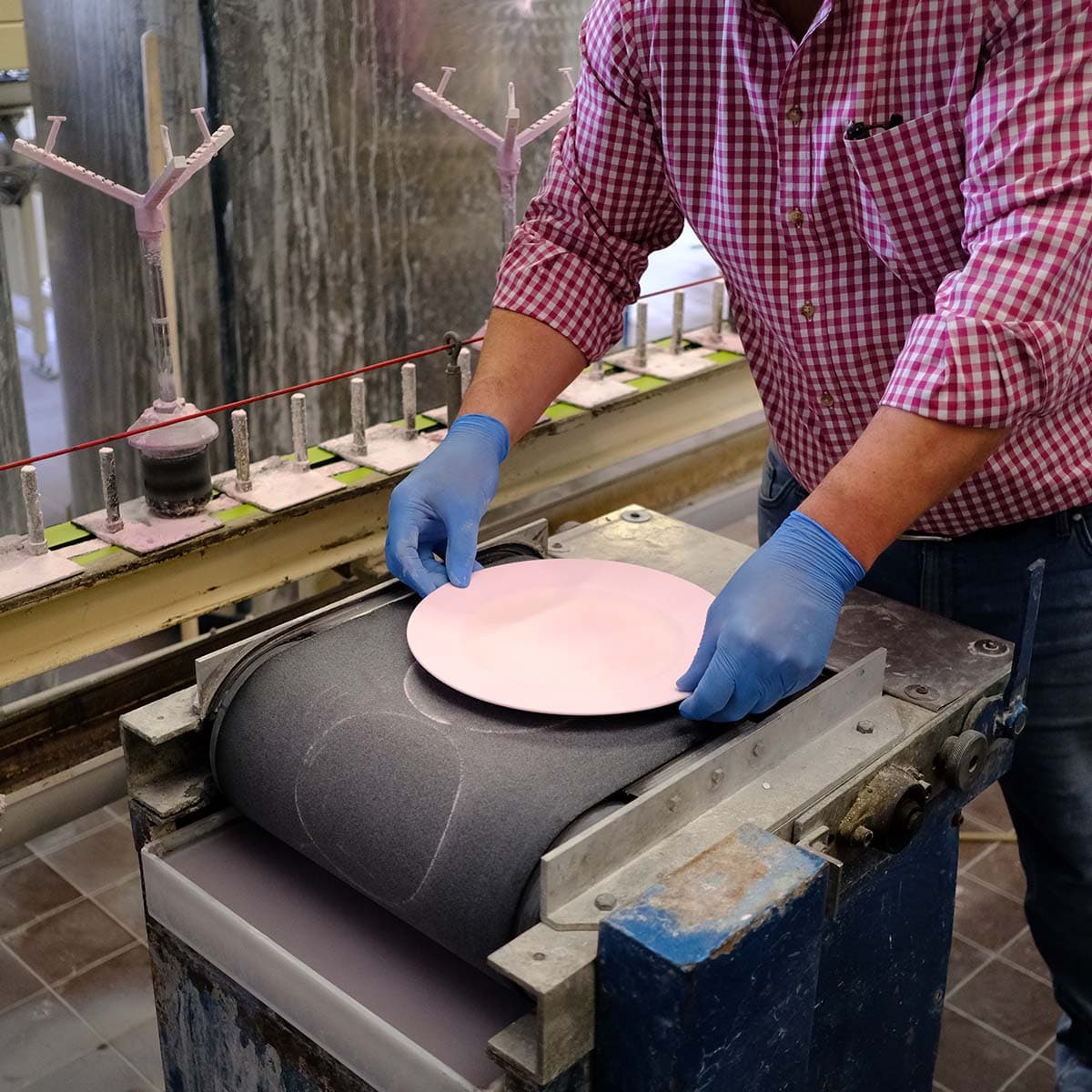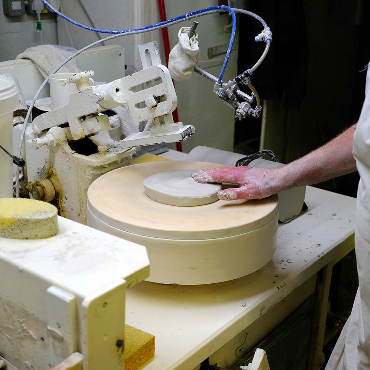 Each plate is foot-wiped to avoid them sticking to the kiln batts during glost firing.