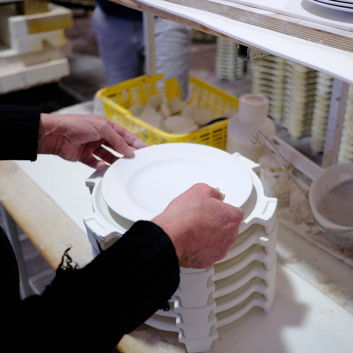 The clay is moulded into the to the plate’s shape by first stretching the clay rolls and then shaping them by hand, with the aid of a mould, on a pottery wheel.