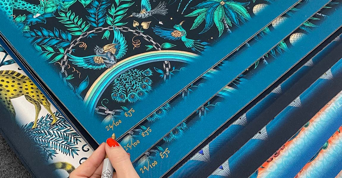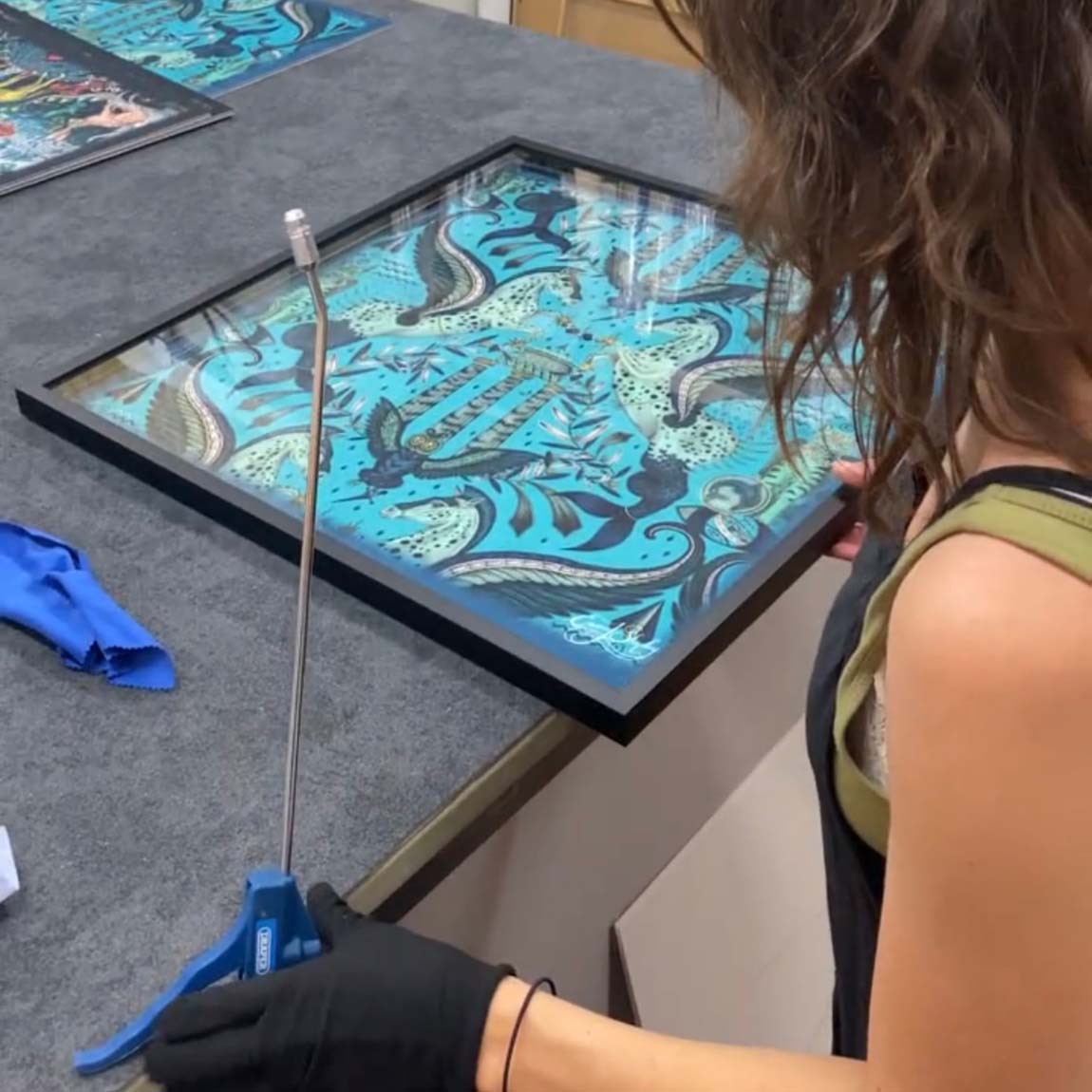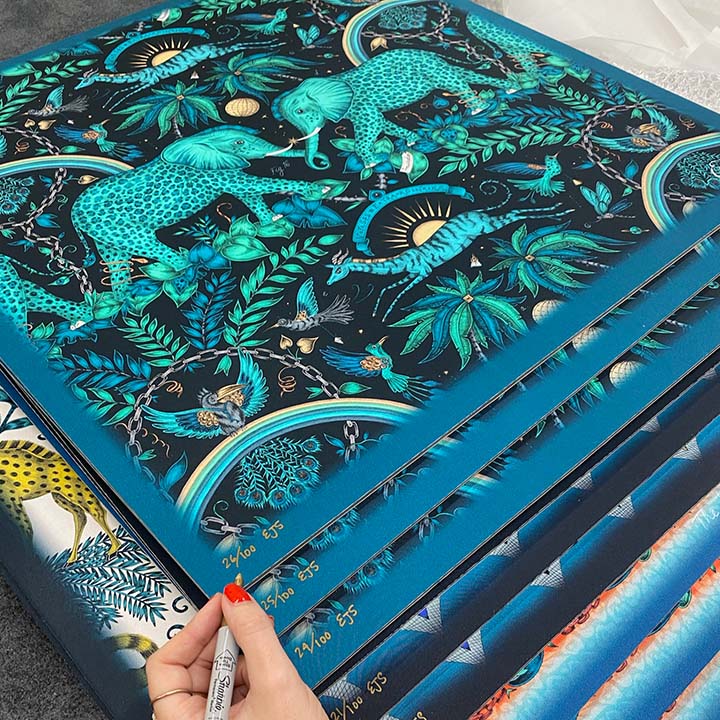 - Once our UK-based factory prints and mounts our silk artworks on their backings, Emma numbers and signs each silk artwork by hand, so they can then be framed to order in London.