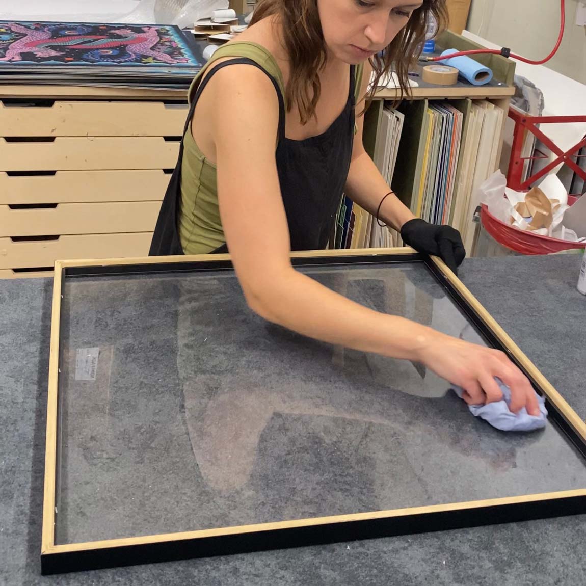 5. To prevent dust from getting trapped during framing, an antistatic foam cleanser is wiped across the acrylic.