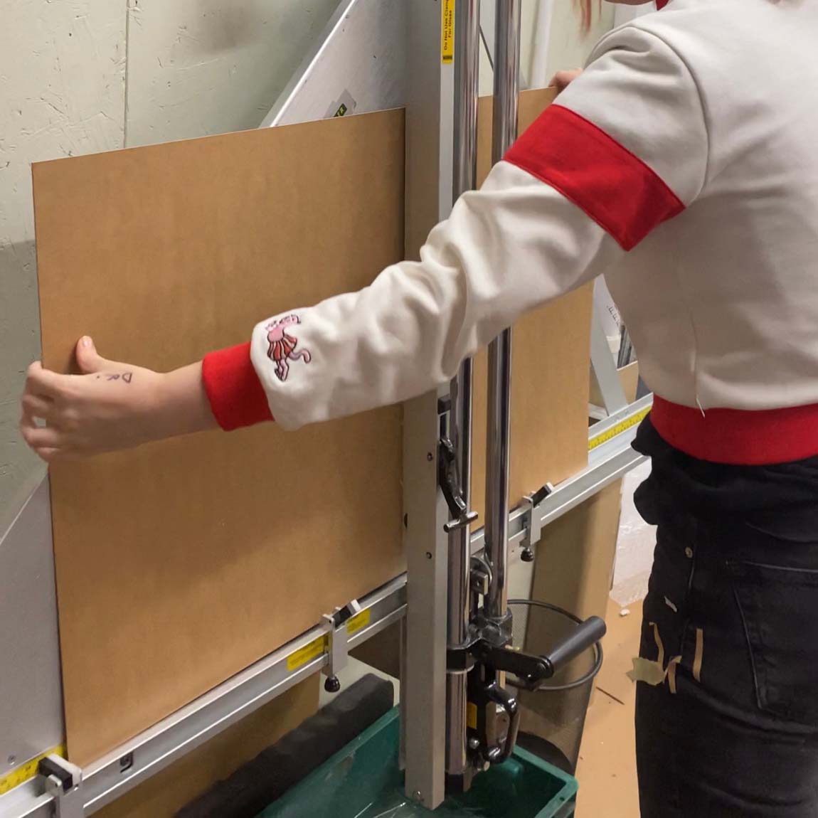 6. Then, the backing board, which holds the acrylic, mount board and artwork together, is carefully cut to size and the picture hooks are added onto the back.