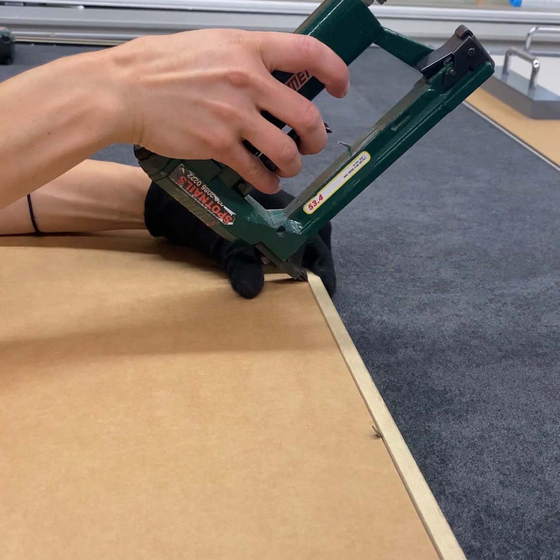 4. A custom cut acrylic sheet is then inserted into the frame, then the carefully cut-to-size wood pieces are slotted into each side, and then a framing point gun is used to secure the wood and acrylic in place