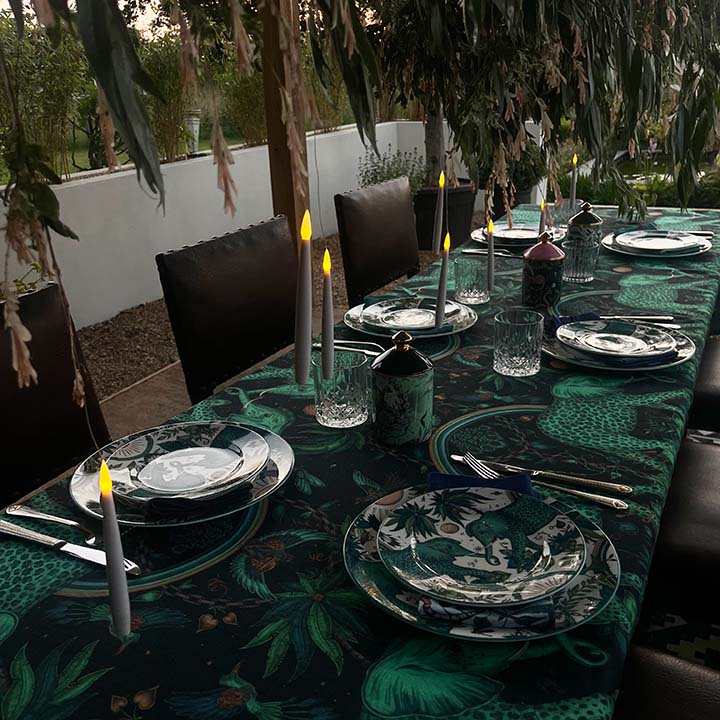Create an enchanting ambiance by embracing the art of lighting. Illuminate your space with flickering candles, casting a warm and inviting glow that sets the stage for an extraordinary evening of elegance and a relaxed, chit chatty atmosphere. Opt for rechargeable LED lighting or delicate fairy lights for a practical yet luxurious alternative. I’ve used the enchanting Wonder World, Zambezi and Highlandia Scented Candles on my table.