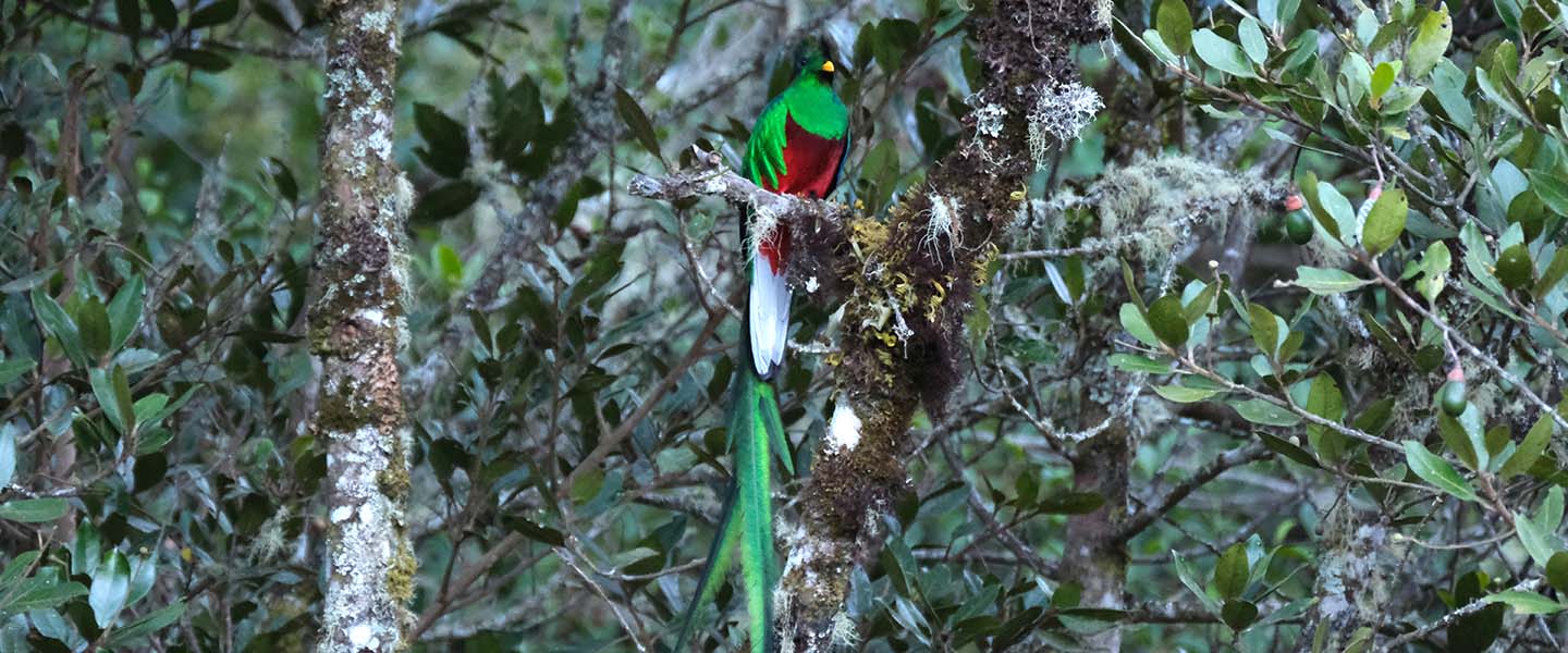 I stayed quiet and close to my expert guide, waiting patiently near a grove of wild avocado trees - the food of choice for this special bird - as the sun started to rise. Just as we were starting to lose hope, a 'kee-kee-kee-keee' calling sound rang out, and there! A flash of green and red emerged from the trees. A glorious male flew across the scene, iridescent green feathers flashing in the sunlight, with his remarkable tail flowing behind like long satin ribbons. After picking and eating one of the many wild avocados on the tree, he sat and waited for it to digest, his long feathers blowing in the breeze. In a flash, he was joined by a female and - yes - another male!