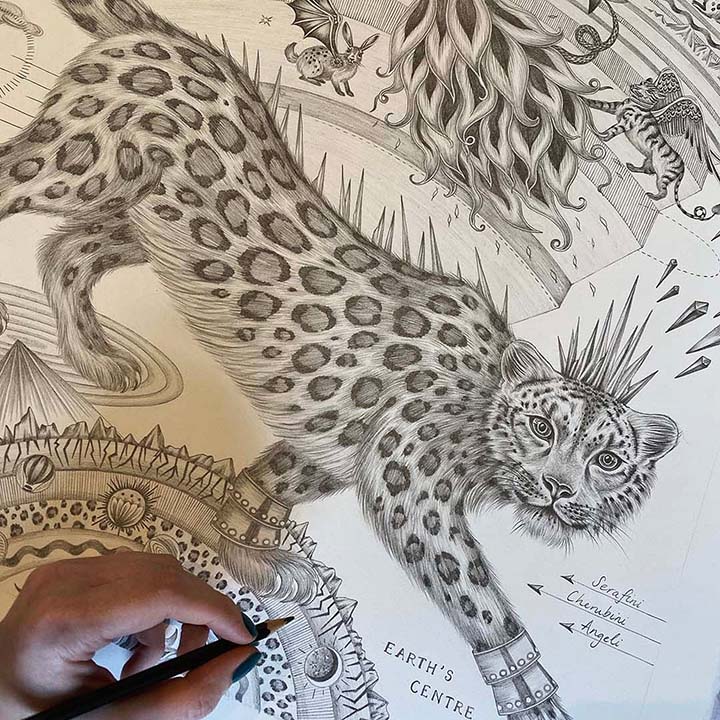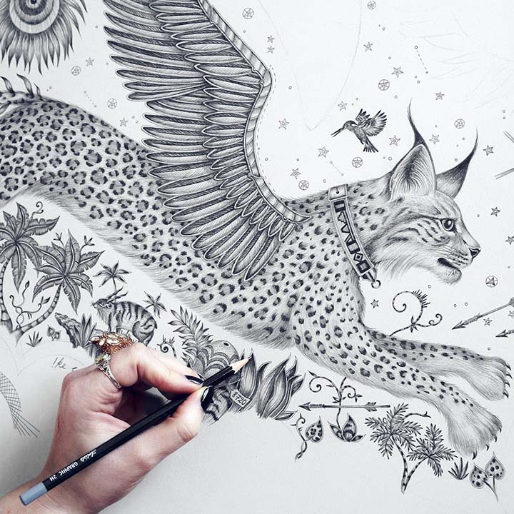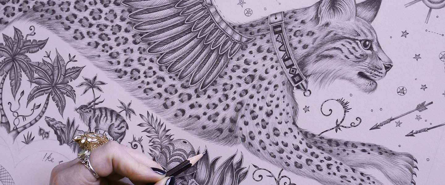 Inspired by Emma's travels in the Western Cape of South Africa, where she explored the ancient rock paintings and mythology of the San people. The enchanting, hand-drawn design features magical winged lynx with peacocks' tails leaping through a starry night sky, surrounded by surreal foliage.