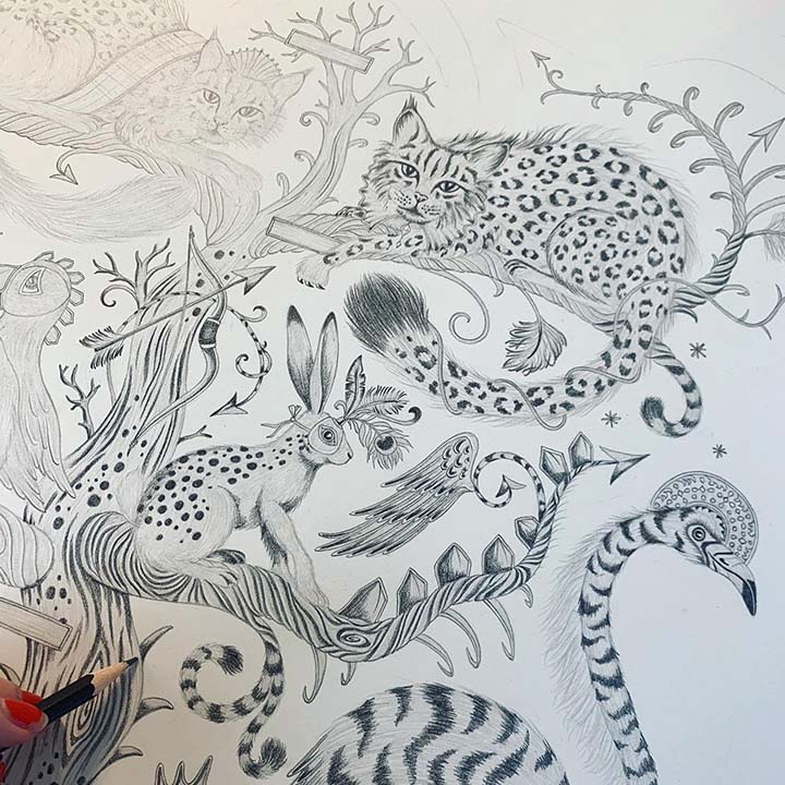 Wonder World will take you on an enchanting fantasy journey through the remote Scottish Highlands. It’s full of whimsical details and features fantastical creatures including striped flamingos, Scottish Wildcats, a puffin and a hare! The hand-drawn design was inspired by Ernst Haeckel's evolutionary tree diagrams, medieval paintings and Mary Queen of Scots.