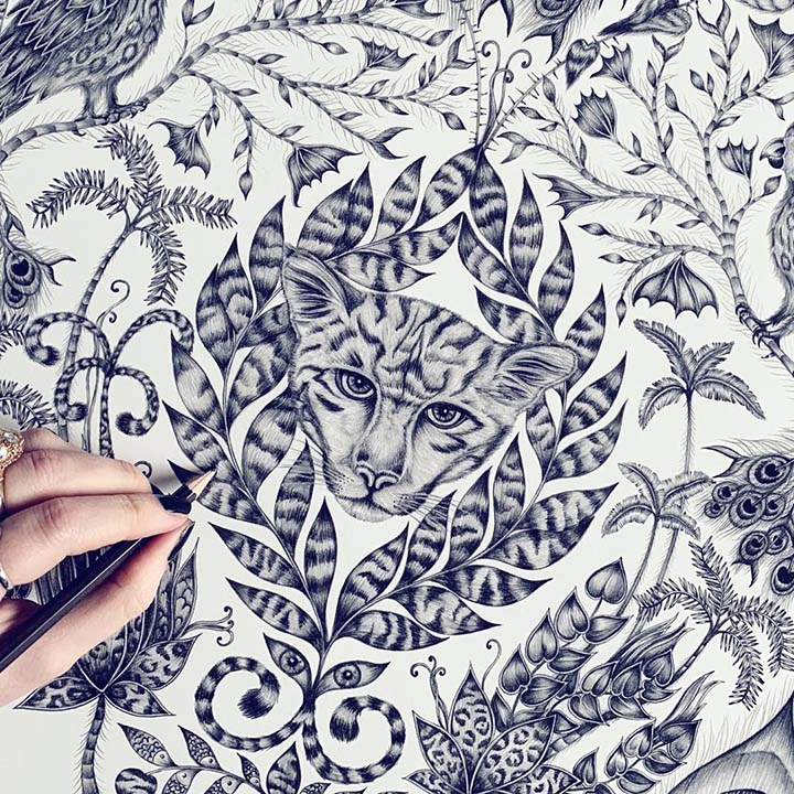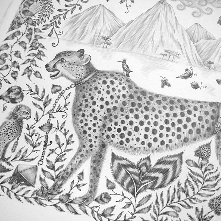 "Amazon was one of my first designs which I drew while I was studying at the Royal College of Art. Inspired by the intensity of the rainforest after my adventures in the Amazon; the design features enchanting creatures and tropical plants where everything is not always as it seems… while the colours I added to the final designs reflect the vibrancy of nature found in the jungle."