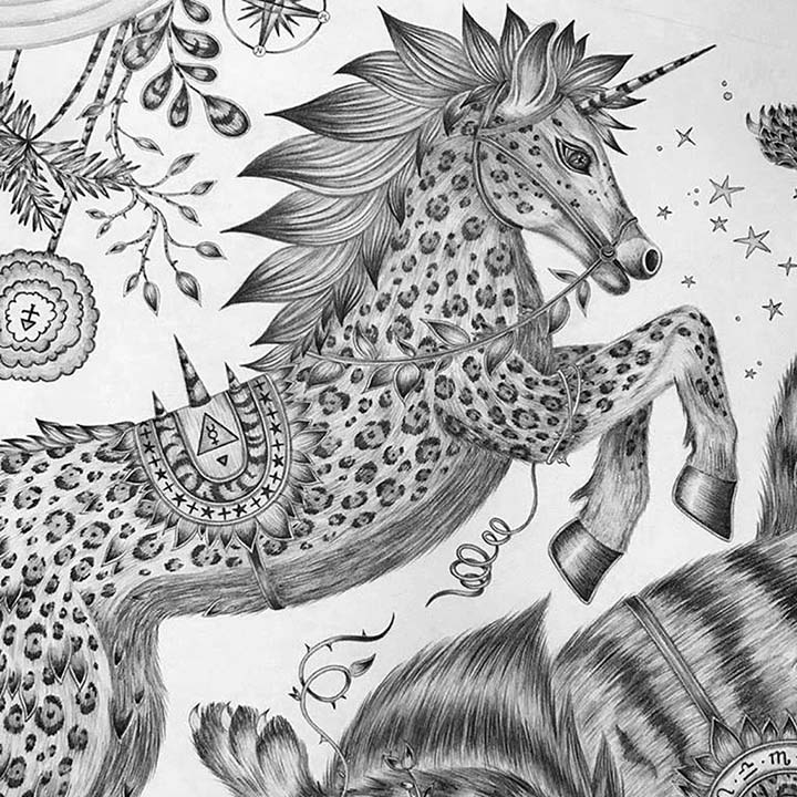 The enchanting Caspian design is inspired by C.S Lewis's Chronicles of Narnia and other magical folk tales. The hand-drawn artwork features a majestic lion and fantastical unicorn from British heraldry, amongst surreal foliage and stars.
