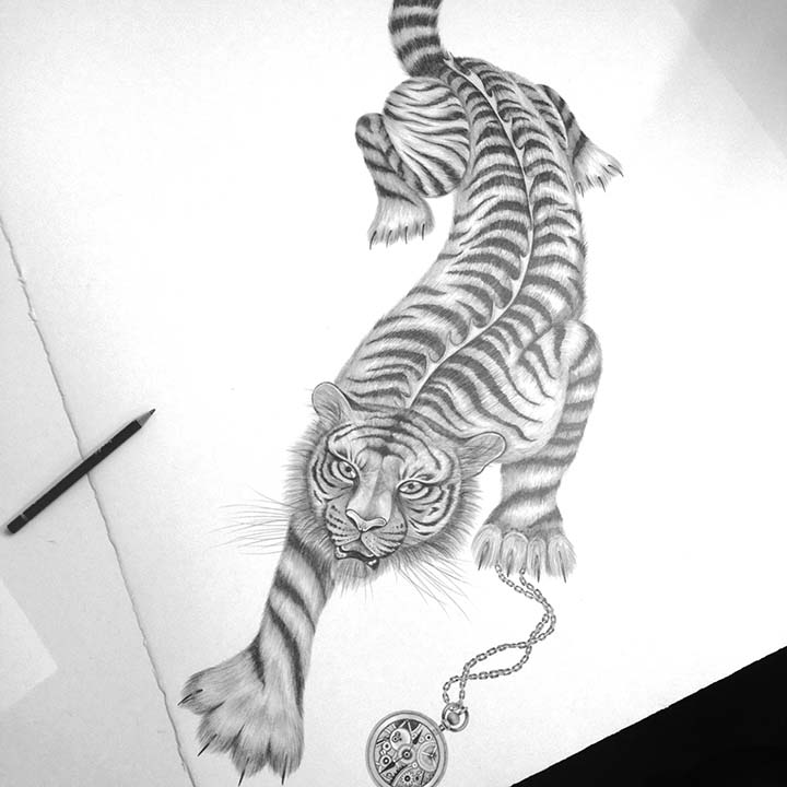 Inspired by Greek and Roman mythology, and hand-drawn by Emma, the wild tiger in this design features a curious peacock tail, dragon spine, pocket watch and a fierce attitude!