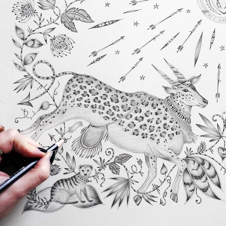 The mesmerising Protea design features curious creatures leaping through a landscape of twisting foliage. Lions, zebras, and antelopes with hunter-gatherer characteristics are inspired by a tradition seen in ancient rock paintings where humans take on animal form.