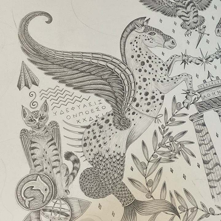 Inspired by Emma’s travels to Greece’s ancient sites, the intricate hand-drawn design features an armoured cat with wings sitting atop an all-seeing eye while a majestic, swooping owl observes the mythical scene from above.