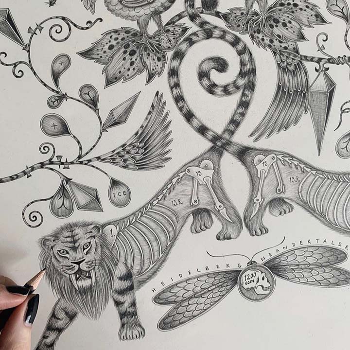 A fierce and fantastical design, Extinct was inspired by ice age creatures and lost species, including dodos and sabre-toothed tigers. Scientific notation and surreal details complete the unique, hand-drawn creation.
