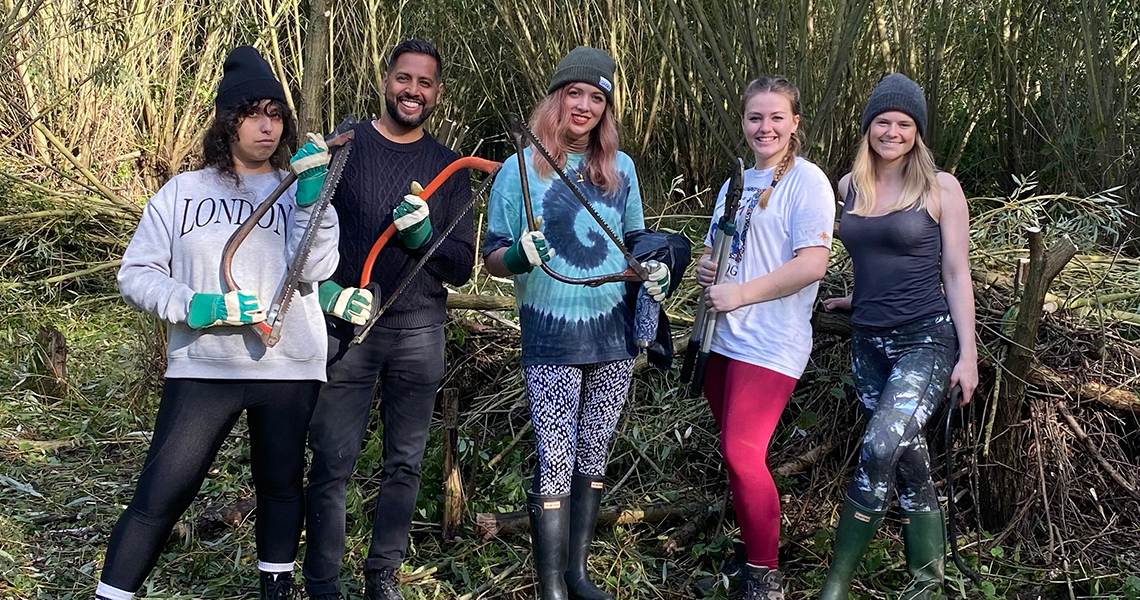 As part of our mission at EJS to give back to the nature that inspires our designs, at the beginning of October, the team and I headed out to the Rye Mead RSPB Nature Reserve in Hertfordshire. The RSPB is the UK's largest nature conservation charity, founded in 1889, and its main mission is to take action for the nature and climate emergency, so we knew they would be a great charity for us to get involved with. On our volunteering day we were tasked with coppicing an area of woodland, which was a brilliant way for us to bond as a team, while giving back to nature by enchancing animal habitats. We spent the day with Bob and Jim, regular volunteerers at the Rye Mead reserve, who helped guide us through the coppicing process. It was brilliant to work outside embracing nature in beautiful surroundings, whilst also helping to give back.