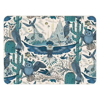 The hand-drawn Frontier design was inspired by Emma's adventures to Yosemite national park in California and the incredible wildlife of the American West. Curious owls, a striking eagle, hummingbird, bees and woodpeckers are framed by wild, leopard-spotted cacti, evoking a feeling of adventure and wonder.