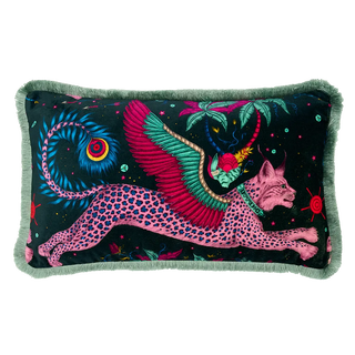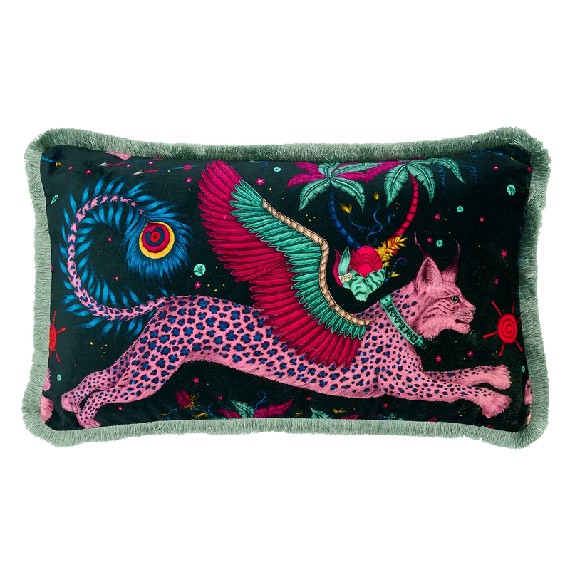 Lynx is one of our most popular designs, and was created by Emma after her travels to the Western Cape in South Africa where she explored the ancient rock paintings and mythology of the San people. The enchanting, hand-drawn design features winged lynx leaping through a starry sky, soaring over a world of magic beneath them. The design is available across many of our collections including fabric and wallpaper, cushions, bedding and tableware.